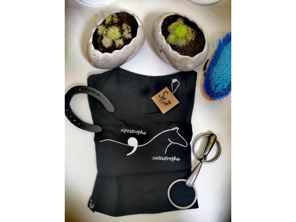 Elegantní černé tričko s humorným potiskem pro všechny, kdo vědí, jaké to je „sedět jako apostrof“. Oblíbená hláška z jezdeckých kruhů teď může být i na tvém tričku!